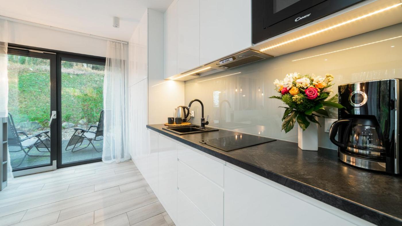 Apartament typu studio. This apartment is comprised of 1 bedroom, kitchenette, a terrace and 1 bathroom with a shower. In the kitchenette, guests will find a stovetop, a refrigerator, kitchenware and a microwave. The apartment offers a dining area, an electric kettle, heating, a flat-screen TV, as well as garden views. The unit offers 1 bed. Apartament - 2 osobowy. Powierzchnia pokoju ok.: 30 mkw.