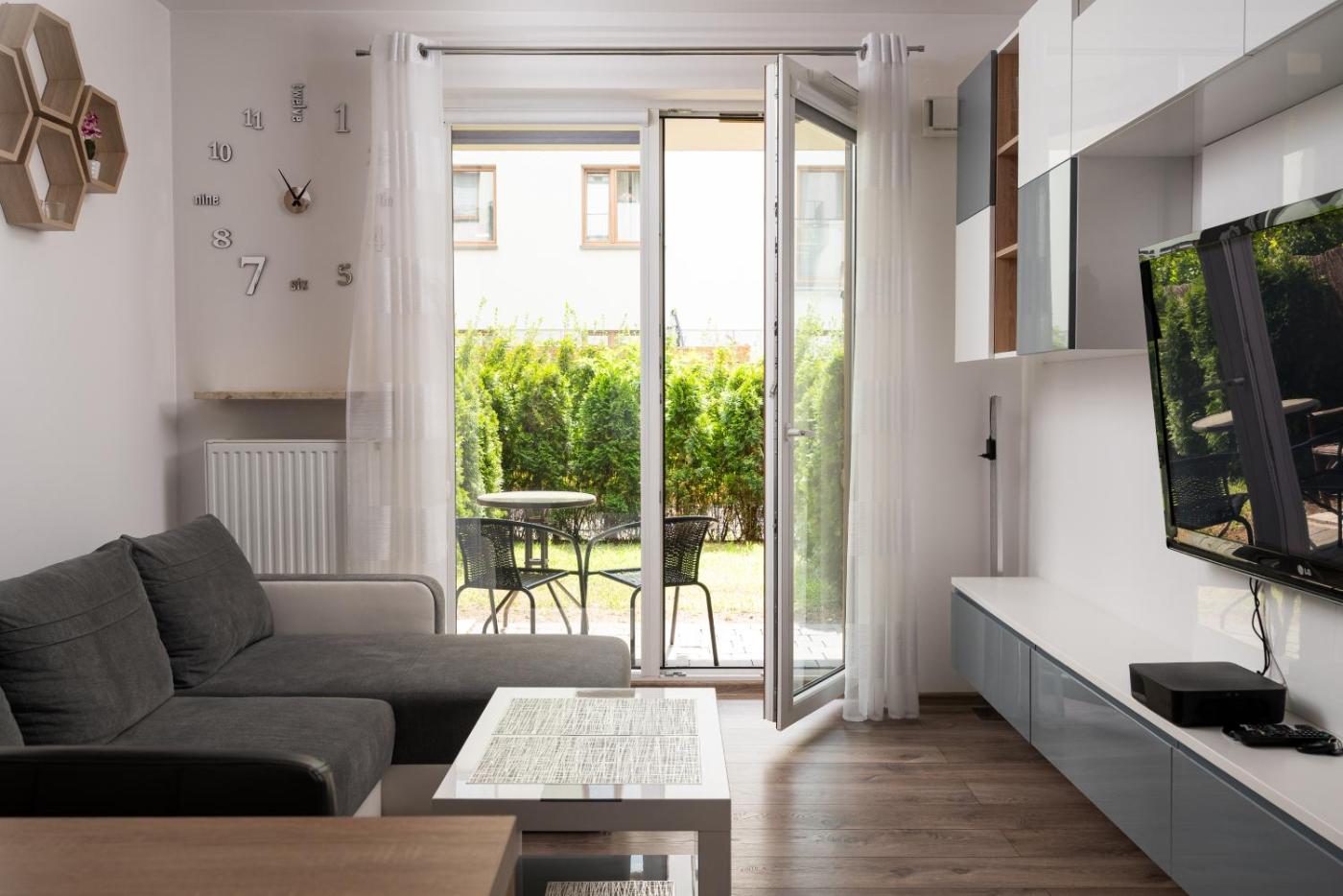 Apartament z 1 sypialnią. Boasting a private entrance, this apartment includes 1 living room, 1 separate bedroom and 1 bathroom with a shower and a hairdryer. In the well-fitted kitchenette, guests will find a stovetop, a refrigerator, a dishwasher and kitchenware. Featuring a terrace with garden views, this apartment also offers a washing machine and a flat-screen TV with cable channels. The unit has 2 beds. Apartament - 4 osobowy. Powierzchnia pokoju ok.: 49 mkw.